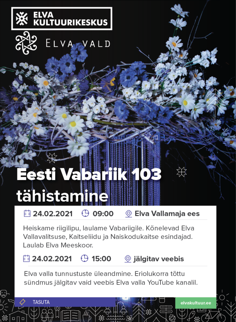 kell 15:00 Elva valla tunnustuste üleandmine. Eriolukorra tõttu üritus jälgitav vaid veebi vahendusel, Elva valla YouTube kanali vahendusel.